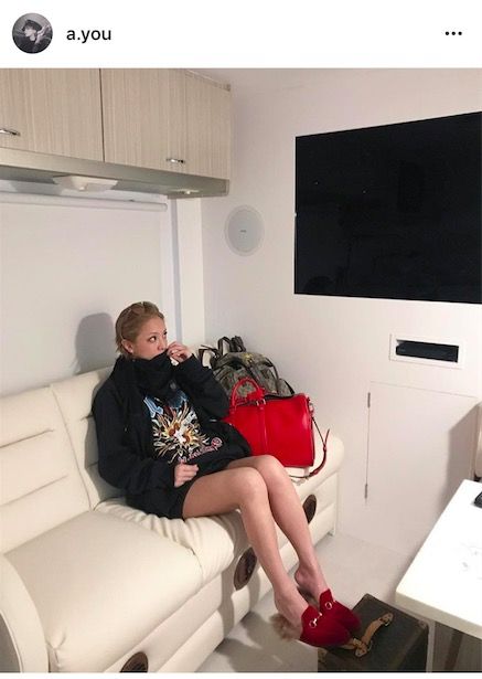 モーターホームとは、家のような機能を備えた車のことで、浜崎の映る写真には大きな画面も設置されているため、車内で撮影した写真と思われる。