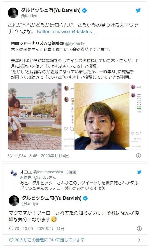 「大リーグのダルビッシュ有が1月14日、木下と乾の不倫疑惑について、『これが本当かどうかは知らんが、こういうの見つける人 マジですごいよな』と投稿したところ、乾が即座にダルビッシュのフォローを外したのです。