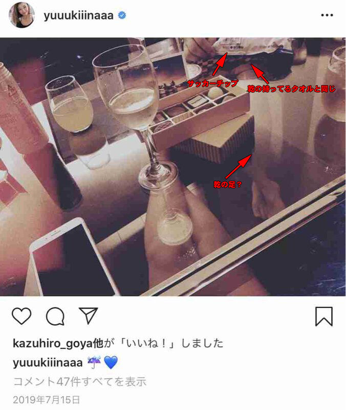 木下優樹菜が投稿している写真にはもう1人の人物が映っておりその向かいに座っている人物が乾貴士ではないかと言われている。